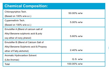 Chlorpyrifos 50% + Cypermethrin 5% EC is a broad-spectrum inseccide used in agriculture, horculture, and forestry to control a wide range of insect pests. It combines the contact and stomach poisoning effects of chlorpyriphos with the fast knockdown and residual acvity of cypermethrin. This dualacon formulaon effecvely manages both chewing and sucking insects, including aphids, thrips, caterpillars, and whiteflies.