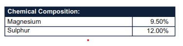 crops green. It is essential for enzyme formation. Enhances carbohydrate usage in plants. Improves nitrogen and phosphorus uptake by crops. Dose: Soil app. : 5 – 10 kg/ acre.