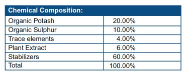 Potash Power containing Potassium and Sulphur ,anessentialnutrients for regulating plant growth. Plant use potassium for water uptake and synthesizing plan sugars. It ensures proper maturation in a plant by improving overall health, root strength, disease resistance and yield rates. Potash Power creates a better