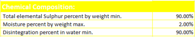 Chemical Composition : Total Elemental Sulphur Present By  Weigt-90% Min.